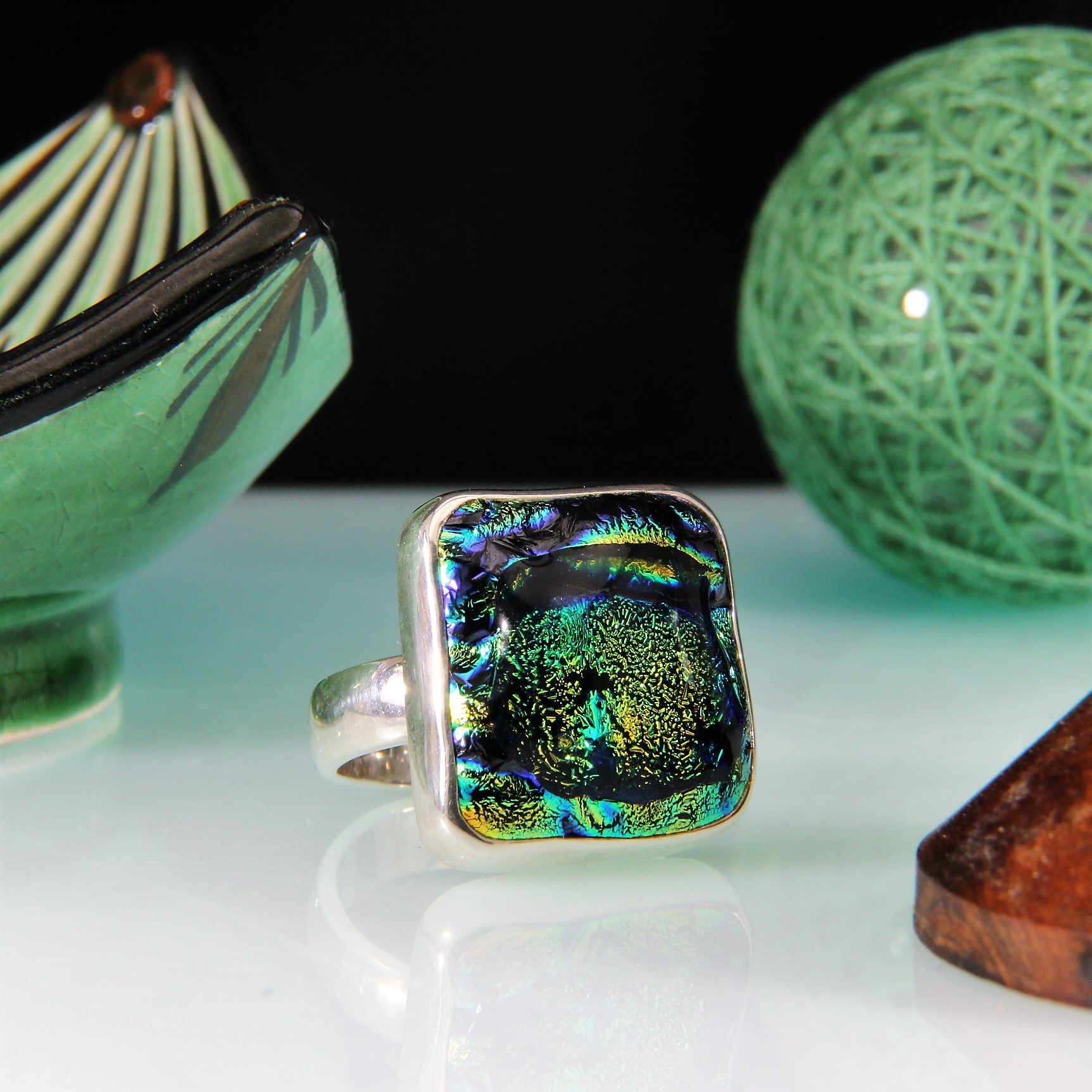 Produkte aus dem Kunstglaser Handwerk. Dichroic-Glas wird mit farbig leuchtenden Metallen bedampft und in mehreren Schichten miteinander verschmolzen. Fusing. Es entstehen einzigartige Reflektionen, die bei unterschiedlichem Lichteinfall Farbwechsel erkennen lassen.